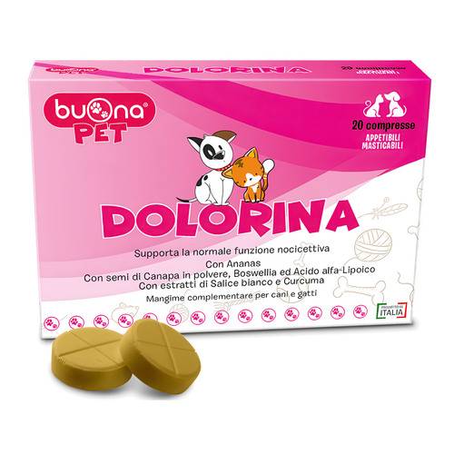 DOLORINADescrizione Mangime complementare per cani e gatti con estratti di Boswellia serrata e salice bianco, ananas gambo, semi di canapa ed acido alfa-Lipoico. DOLORINA è formulata in compresse appetibili masticabili ed è utile per supportare la normale funzione nocicettiva nell’animale. Componenti Proteine animali idrolizzate (origine avicola), prodotti ottenuti dalla trasformazione delle erbe (ananas - Ananas comosus L.- gambo polvere) 14%, lieviti (lievito di birra), acido alfa-lipoico 4%, semi di canapa (Cannabis sativa L.) in polvere 4%, sale di magnesio dell’acido stearico, mono- di- e trigliceridi di acidi grassi (acido pa...